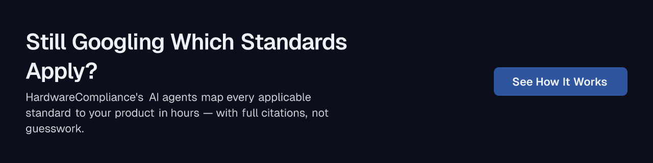 HardwareCompliance uses AI agents to surface every applicable requirement and auto-generate lab-ready documentation. If your team is spending months on regulatory research just to figure out where to start, a conversation with the HardwareCompliance team can provide a clear path forward.