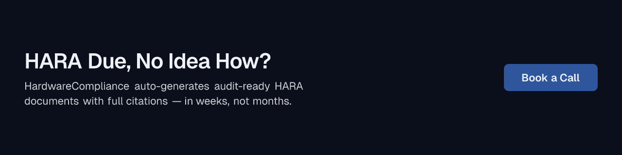 HardwareCompliance is designed for this specific challenge. The platform's AI agents automate regulatory research, HARA documentation, and test planning, turning months of manual work into weeks. If your team is blocked by compliance, book a call to see how an AI-driven approach can accelerate your path to certification.