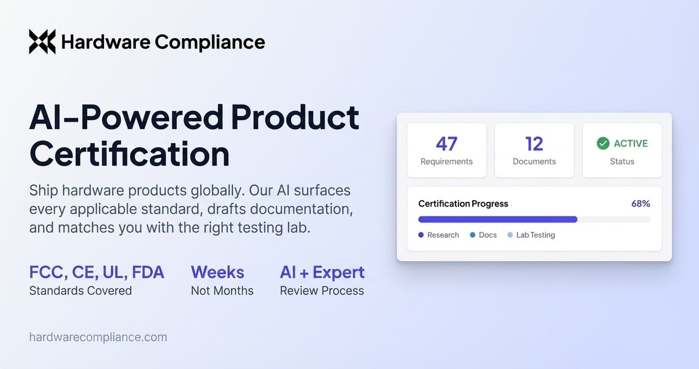 SAN FRANCISCO, March 2026 — HardwareCompliance has launched an AI hardware product compliance agent designed to replace the months-long, consultant-driven process of getting physical products certified with an automated workflow that takes weeks. The platform covers FCC, CE Marking, FDA 510(k), UL Certification, ISO, FAA, IEC, MIL-STD, and more — handling everything from regulatory research through documentation drafting to testing lab matching.