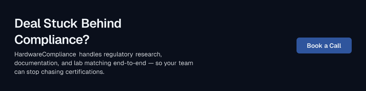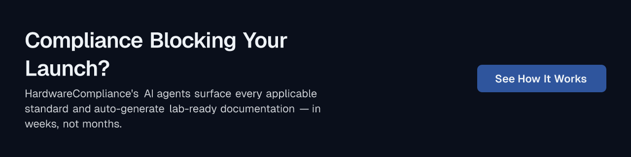 Your engineers' time is better spent building your next product than parsing FCC Part 15 or assembling a CE Technical File from scratch. If your product launch is blocked by compliance, book a call with HardwareCompliance to see how AI agents generate lab-ready documentation and help get your product to market faster.