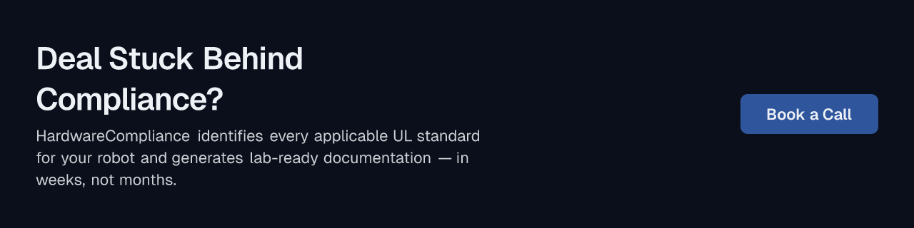 Now imagine discovering, six months into development, that your PCB layout violates UL creepage requirements, or that your enclosure doesn't meet guarding standards — after the design is frozen. That's not a theoretical risk. It's the most common reason robotics hardware teams blow their certification budgets and miss their launch windows.