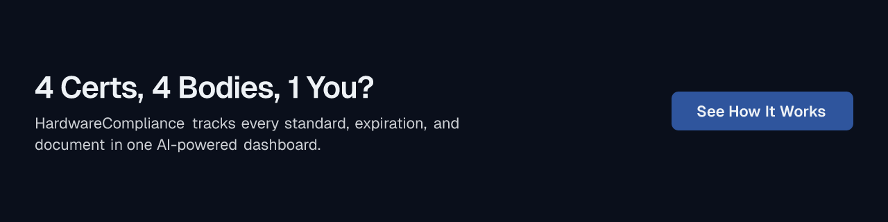 Hardware compliance across FCC, CE, UL, and ISO is genuinely hard. The complexity is real, the costs are significant, and the risks of dropped balls — missed renewals, untracked standard updates, undiscovered applicable requirements — compound directly into delayed launches and failed market entries.