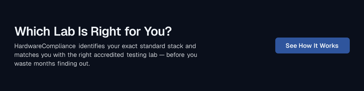 If you're selling on Amazon and facing requirements like "tested by a laboratory certified to ILAC ISO 17025 to the appropriate US safety standard," HardwareCompliance surfaces the qualifying labs for your exact product — not a generic shortlist.