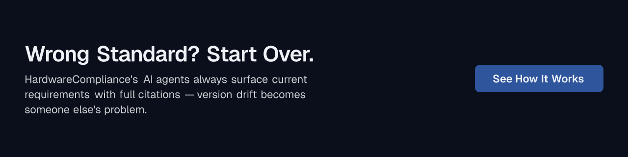 How to avoid it: Before any testing begins, verify the current version directly with the issuing standards body (ISO, IEC, ANSI, etc.) and confirm which version the testing lab is currently accredited against. An AI-powered platform like HardwareCompliance automatically surfaces requirements from current standard versions with full citations — so version drift becomes someone else's problem.