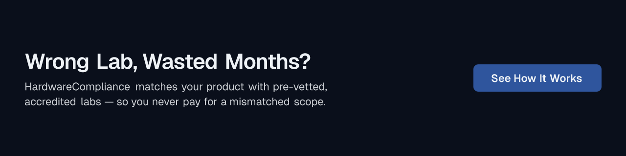 Or let HardwareCompliance do the heavy lifting. Book a call to see how the platform identifies every applicable standard and matches you with a pre-vetted lab that's already been interrogated on your behalf. That way, you can stay focused on what you do best: building great hardware.