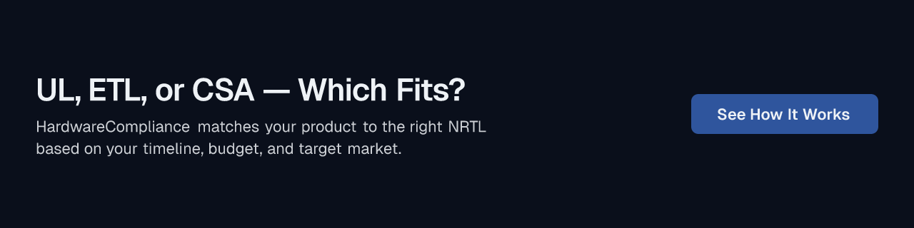 If you're navigating UL certification for consumer electronics, weighing ETL against CSA for a dual-market launch, or simply trying to figure out which standards apply to your product in the first place, HardwareCompliance gives you answers grounded in your actual product — not generic advice.